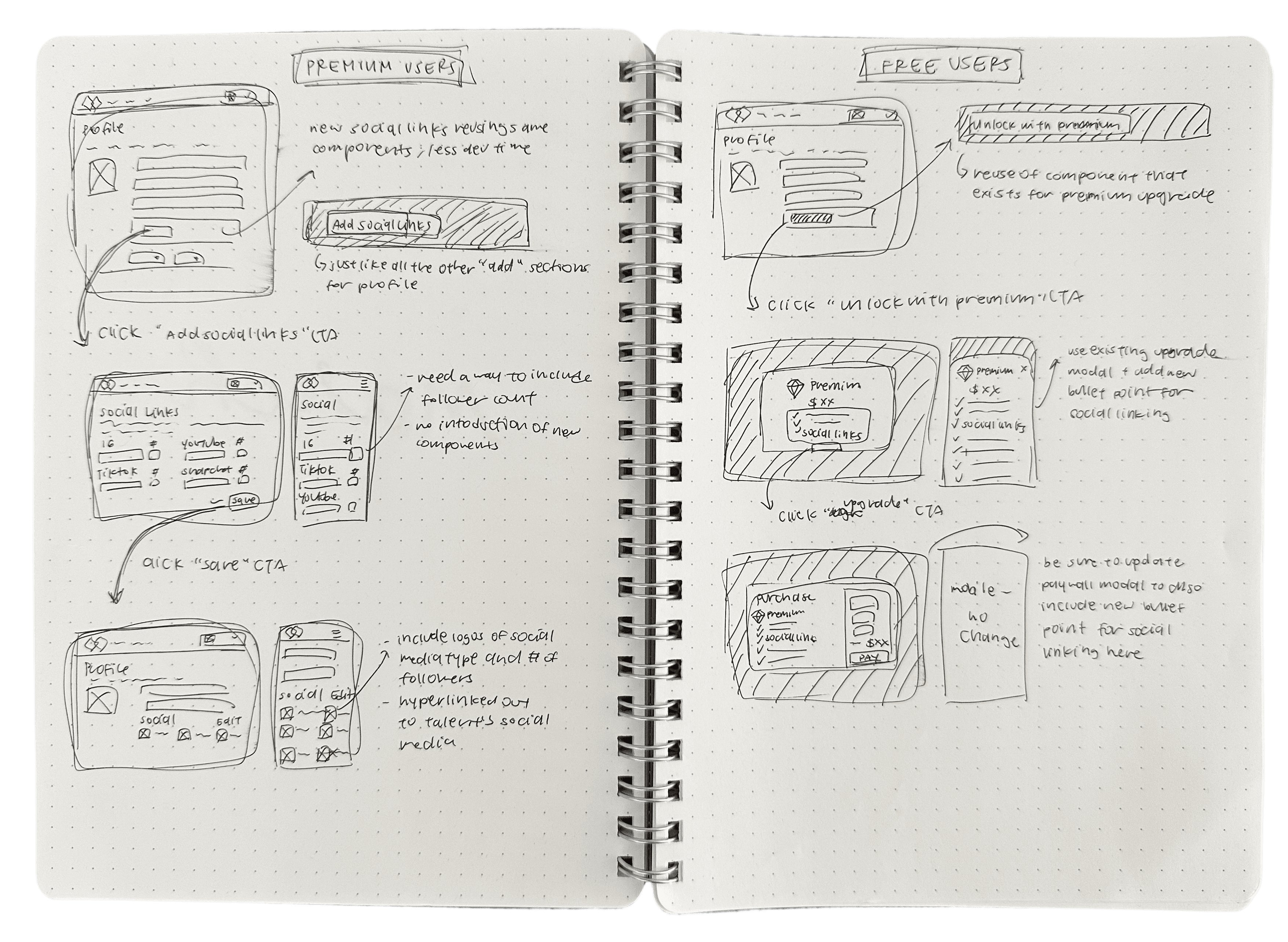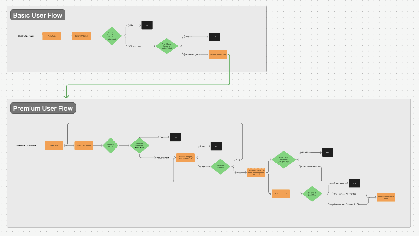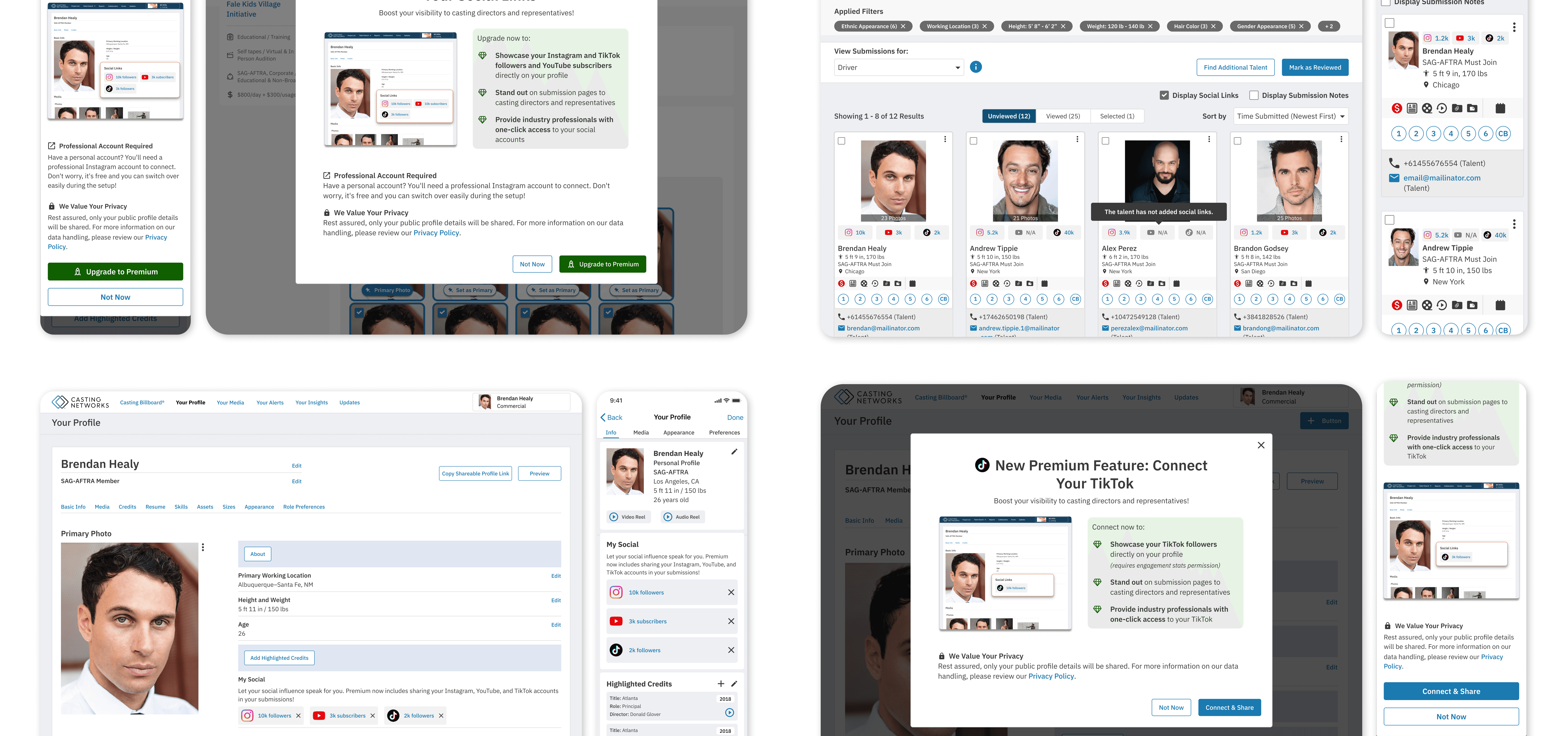 To ensure a seamless experience, my PM and I mapped out detailed user flows for the new social integration feature. These flows outlined how talent would connect their social accounts, how casting directors would discover and interact with that content, and where these touch points aligned within the existing platform. By visualizing the end-to-end journey, we were able to identify potential friction points early on, such as account authentication or profile visibility settings, and design clear paths to resolve them. This process not only clarified the user experience but also aligned the product and engineering teams around a shared vision for how the feature would function.